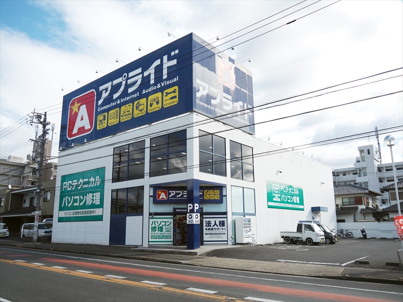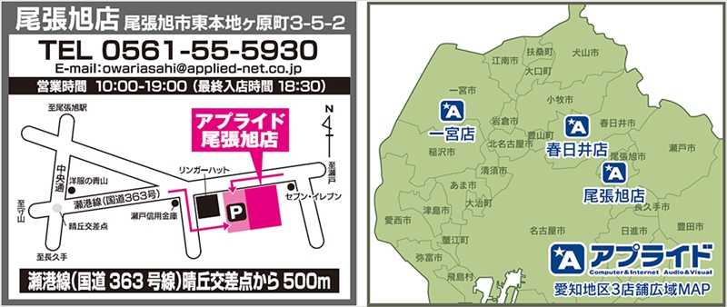 アプライド尾張旭店は、国道363号線沿いにある店舗だ。店舗壁面側全てが広々とした駐車場になっていて、車で来やすい店舗になっている。