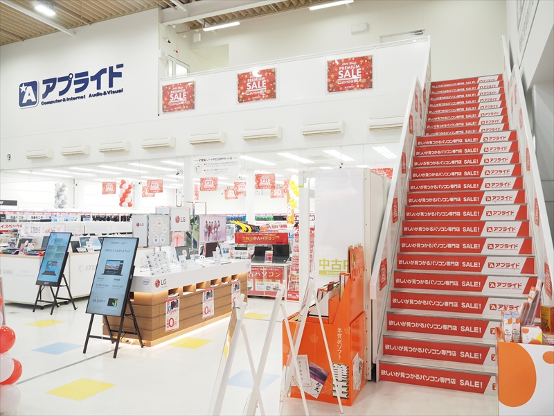 パソコン専門ショップと聞くと、都心に住んでいる人のイメージは、秋葉原の雑然としたマニアックな空間を思い浮かぶ人もいるかと思う。しかし、地域の幅広い年齢の方が来店される店舗というだけあって、大きく目立つPOPに開放感のある空間で、親しみ易さを感じる。