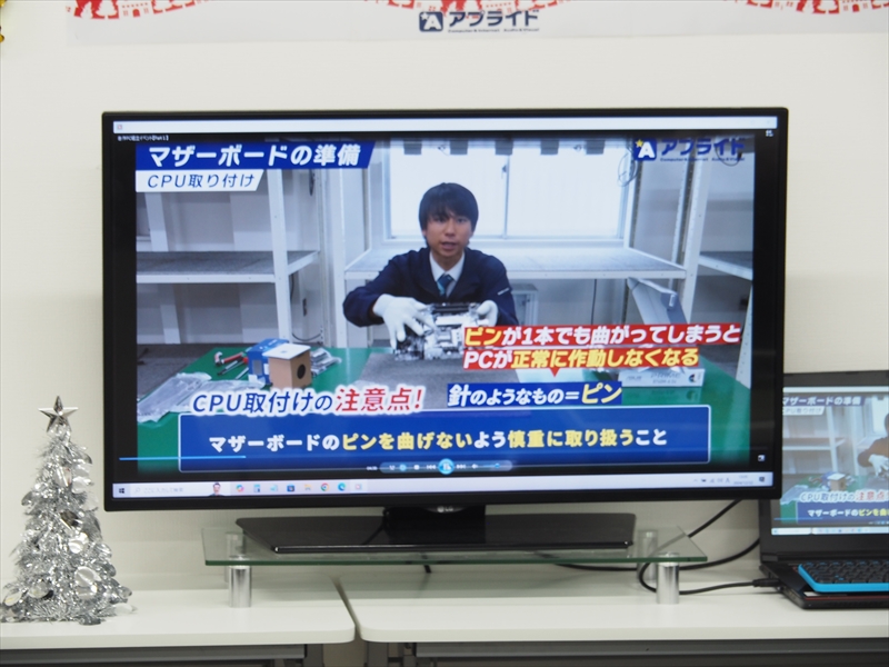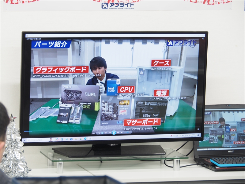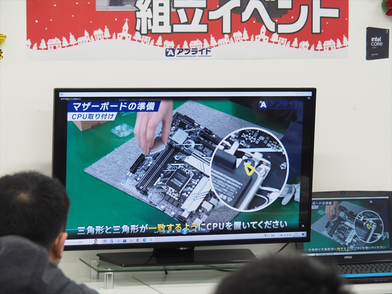 イベントには常時スタッフが最低2人、時間によって3人が参加してサポート。イベントが開始すると、諸注意の後に同社が作ったPC自作の動画が正面ディスプレーに流された。