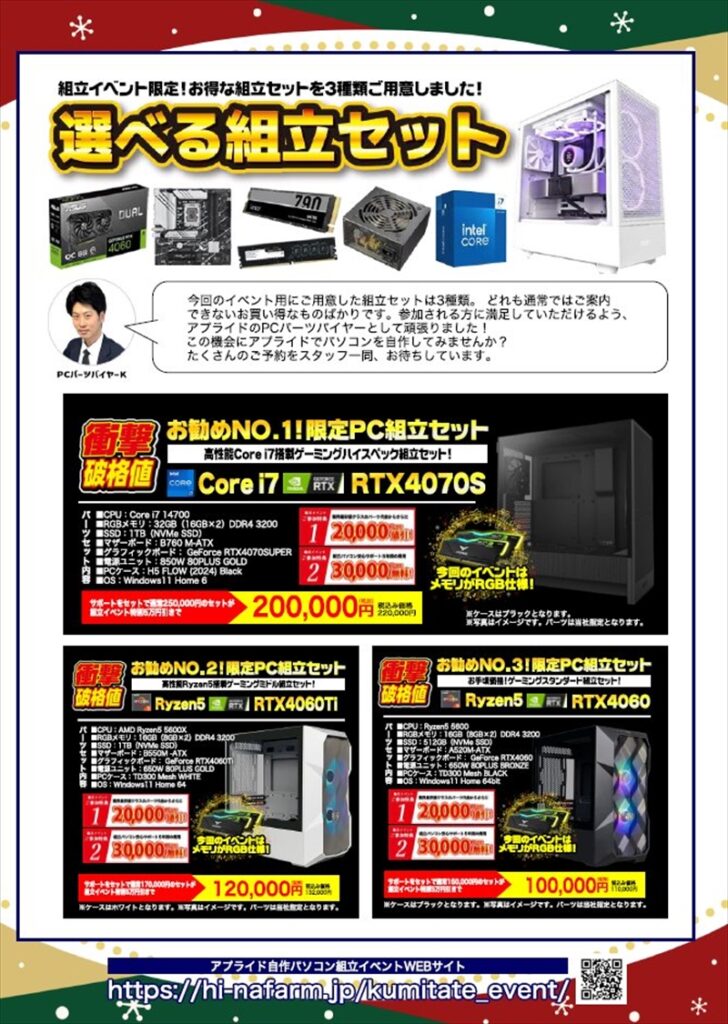 また、イベントの特設サイトでは、組立セットのみを選んで予約するだけだったが、予約後に店舗から連絡が来た際に用途を聞いたうえで、以下の特別価格のカスタマイズセットもご提案しているとのこと。基本は組立セットの構成から、カスタマイズセットのパーツに変更する形だが、事前に要望があって店側で在庫や取り寄せが可能なら、カスタマイズセット以外のパーツとも変更できるそうだ。