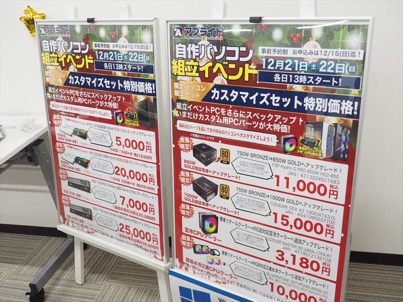 今回のイベントでは、パーツ構成の異なる20万円、12万円、10万円と3つの組立セットが選べるようになっていたが、アプライド尾張旭店では21日・22日合わせて13組のうち11組が20万円と、最も上の構成を選んでいたとのこと。