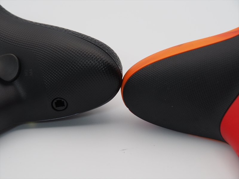 その裏側のシボ加工は、通常のXboxコントローラーよりはやや粗く、より滑り辛いように感じるが、カスタムで裏面をゴム製に変えたXboxコントローラーよりは滑る。ゴムだと時間が経つと加水分解が起こるので、長く使うなら本機の方が良いかもしれない。