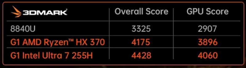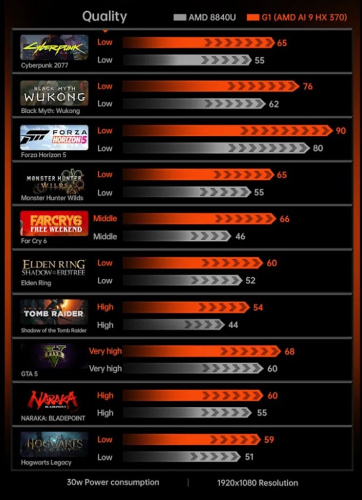 本キャンペーンでは、搭載するCPUがAMD「Ryzen AI 9 HX 370」(12コア/24スレッド、最大5.1GHz)、AMD「Ryzen 7 8840U」(8コア/16スレッド、最大5.1GHz)、インテル「Core Ultra 7 255H」(16コア/16スレッド、最大5.1GHz)と、3つのバージョンが用意されている。公式が現在公開しているベンチマーク結果では、AMD「Ryzen AI 9 HX 370」はAMD「Ryzen 7 8840U」と比べて、フルHDでのゲーム性能がやや優っていることがわかる。