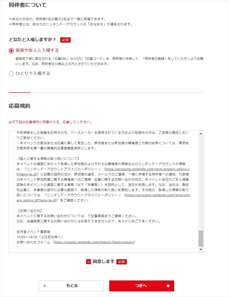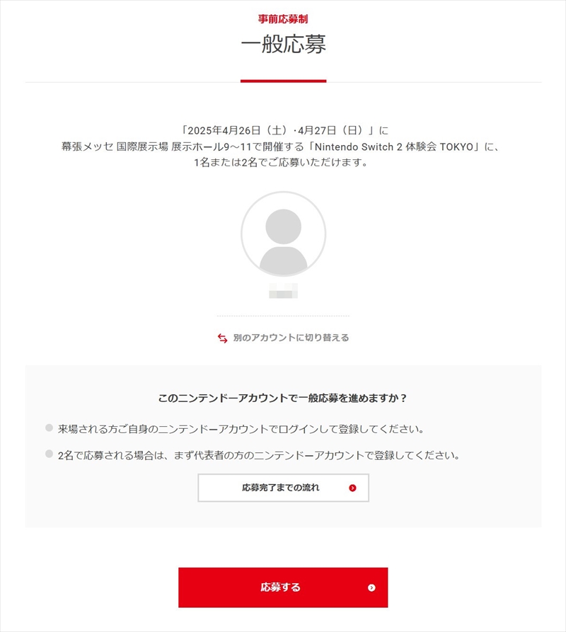 また、応募には無料のニンテンドアカウントが必要となっている。応募は代表者1名を登録し、同伴者がいる場合は代表者の登録後に発行される「応募URL」ならびに「応募コード」を、2人目の方(同伴者)に共有。
