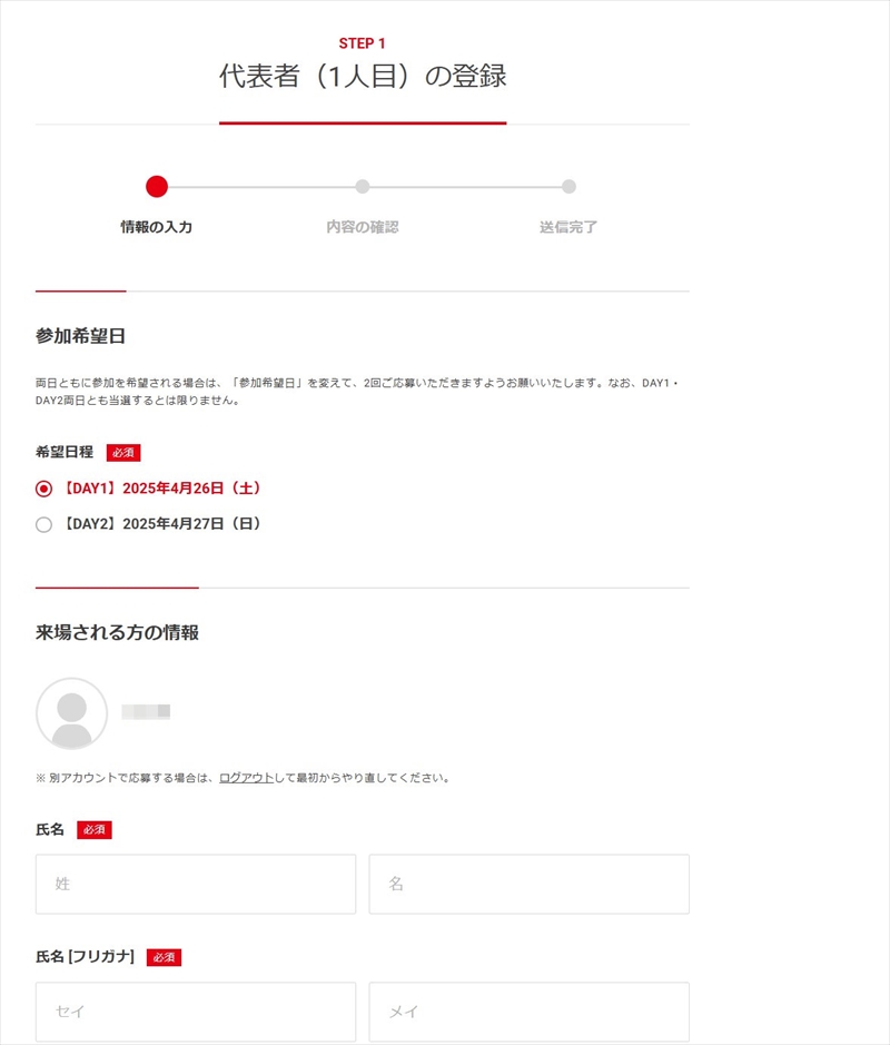 上記の手順の後に入力情報の確認があり、「送信」すると応募が完了する。同伴者がいる場合は、応募URLと応募コードが表示されるので、それを同伴者の友人または家族に伝える。