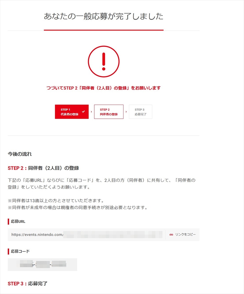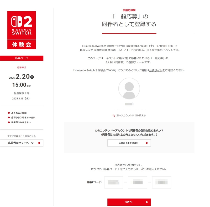 代表者の登録完了時に表示される「応募URL」を開き、ニンテンドーアカウントでログインすると応募コードを入力する画面が表示される。2月20日までに、応募コードで同伴者が応募しなかった場合は、自動的に代表者のみが応募する形となるようなので気を付けよう。