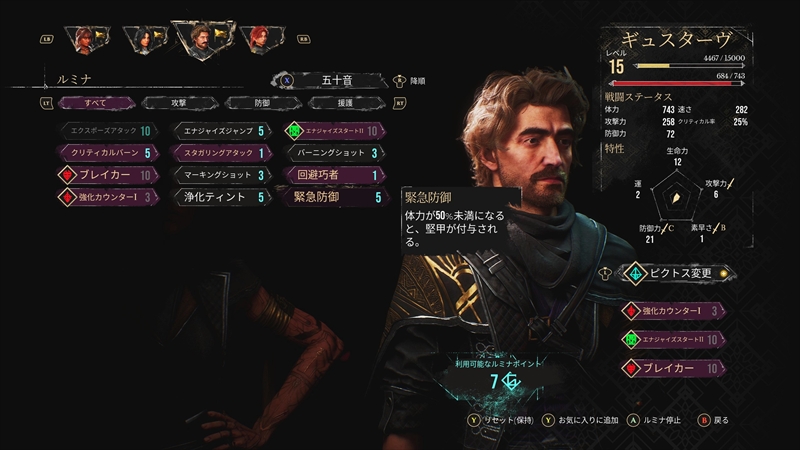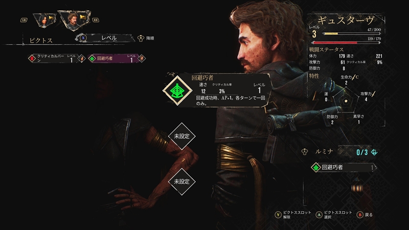 Expedition 33は戦闘のみならず、RPG要素も魅力のひとつだ。「敵を倒す→経験値を稼ぐ→レベルアップ→ステータスアップ」までの流れはRPGの定石というべきだが、本作の面白いところはパッシブスキル(ピクトス)同士のシナジー効果にある。スキルの組み合わせ次第では、規格外のダメージ量を引き出せたり、攻略が有利になったりする場合も。