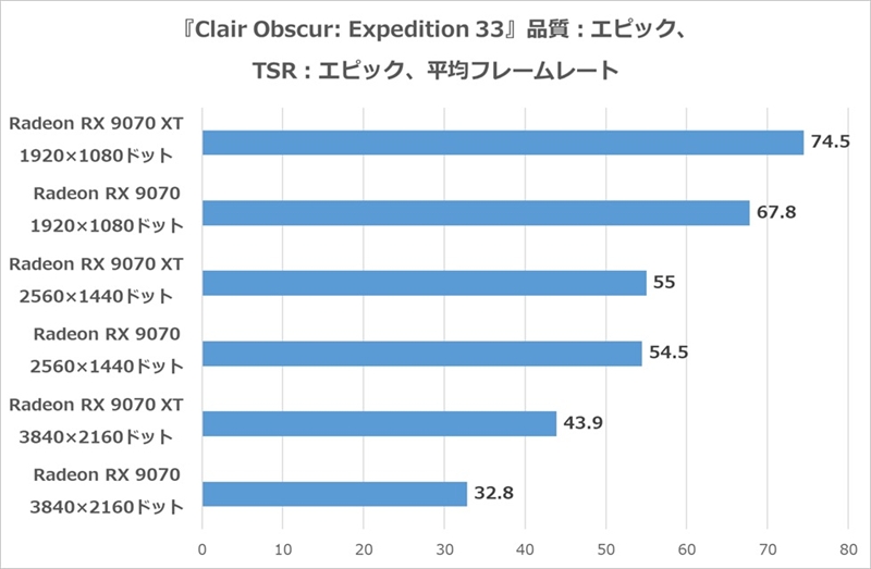 計測は「いにしえの聖域」での移動と戦闘1回を行なった際のフレームレートをCapFrameXにて行った。グラフィックのプリセットはすべて最高設定の「エピック」としている。『Clair Obscur: Expedition 33』はAMDのアップスケーリング技術FidelityFX Super Resolution(FSR)には非対応だが、解像度が4K以下の場合は有効にできるRadeon Super Resolution(RSR)は使用している。