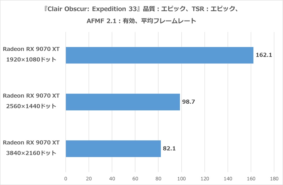 そこで、ゲーム側で非対応でもフレーム生成が行なえるAMD Fluid Motion Frames 2.1(AFMF 2.1)を使用した際のフレームレートも確認してみた。上記のとおりRadeon RX 9070 XTとRadeon RX 9070では、高解像度だと大きな開きもなかったので、Radeon RX 9070 XTでのみ使用。AFMFで補完した際のフレームレートは、CapFrameXでは測定できないため、AMD純正のロギング機能でフレームレートを計測している。