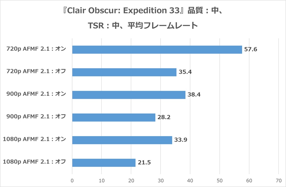 AFMF 2.1では従来バージョンよりも安定性が増し、一部ゲームだとキャラクターを動かした際に表示されていたキャラの周囲が何重にも重なって見えるゴーストもでなくなっている。『Clair Obscur: Expedition 33』もそうした現象なく快適に動作し、画面のカク付きもなく、フレームレートもAFMF 2.1を使用していないときのほぼ倍になっている。