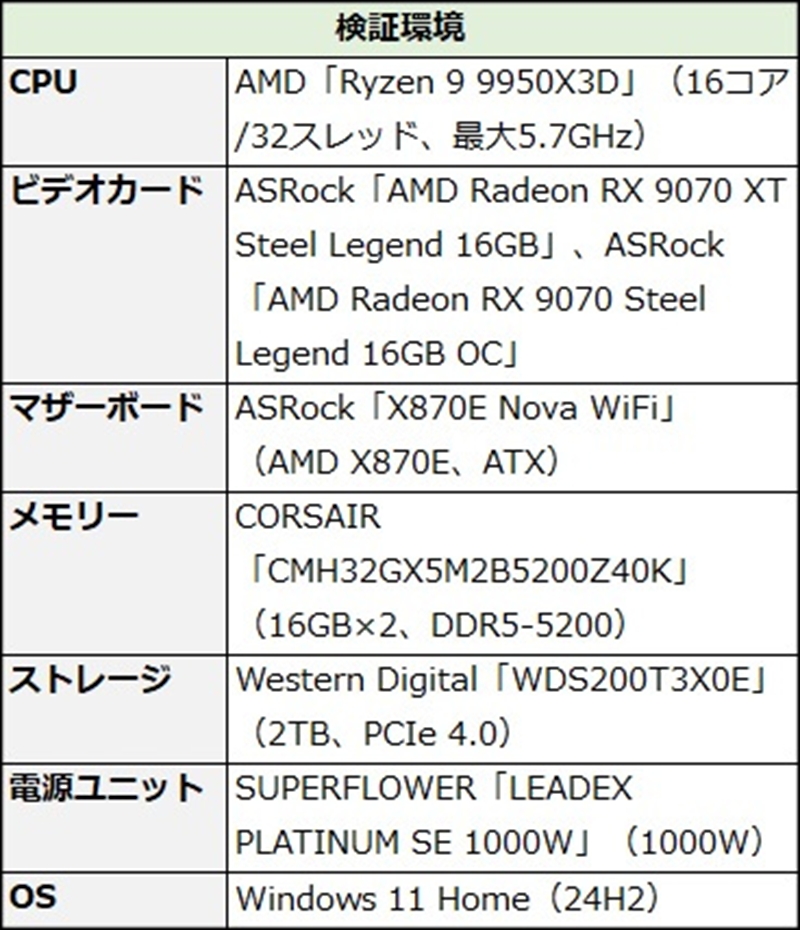 せっかく、映像が綺麗なので高解像度でプレイしたいところだが、どれぐらいのスペックが必要なのだろうか。そこで、2025年3月に発売されたばかりで、最新の重いPCゲームも快適にプレイできると人気が高いAMD「Radeon RX 9070 XT」と「Radeon RX 9070」を使って、高解像度の動作もチェックしてみた。検証環境は以下のとおり。