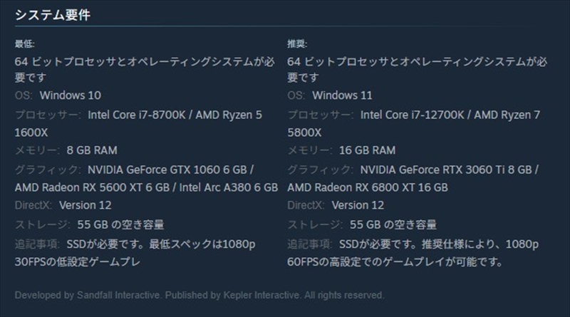 『Clair Obscur: Expedition 33』Steam版の推奨スペックは、CPUが第12世代インテル「Core i7-12700K」(12コア/20スレッド、最大5.0GHz)&AMD「Ryzen 7 5800X」(8コア/16スレッド、最大4.7GHz)と、4~5年前のメインストリームとなっている。