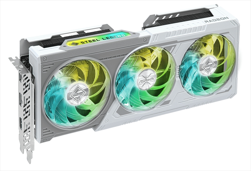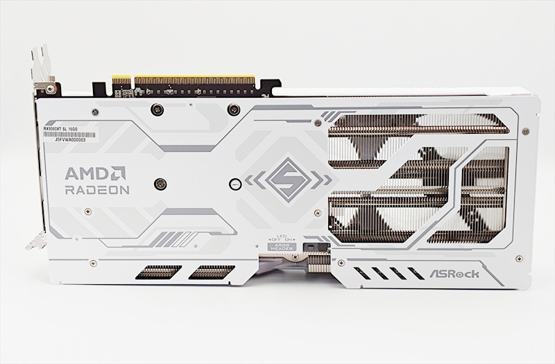 「AMD Radeon RX 9060 XT Steel Legend 16GB OC」と「AMD Radeon RX 9060 XT Steel Legend 8GB OC」のフロントカバーやバックプレートのデザインは、上位モデルの「AMD Radeon RX 9070 XT Steel Legend 16GB」(RX9070XT SL 16G)と変わらない。