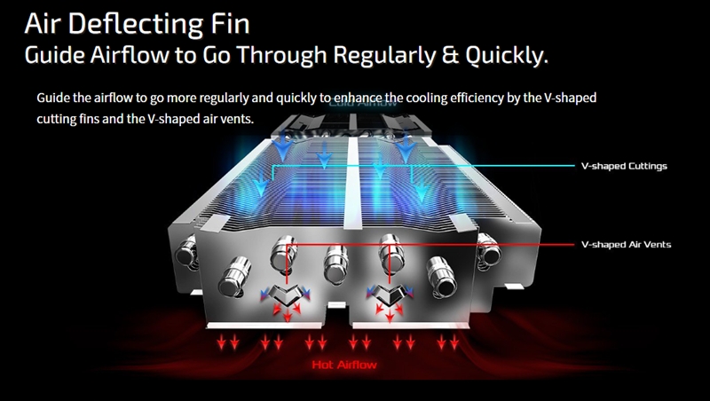 さらに、密度を増やしたV字型のカッティングフィンと通気孔により、空気の流れをより効率よく誘導。そのうえ、敷き詰めたヒートパイプにより、上手に熱を各フィンに伝わり、高い冷却性能を実現するとしている。