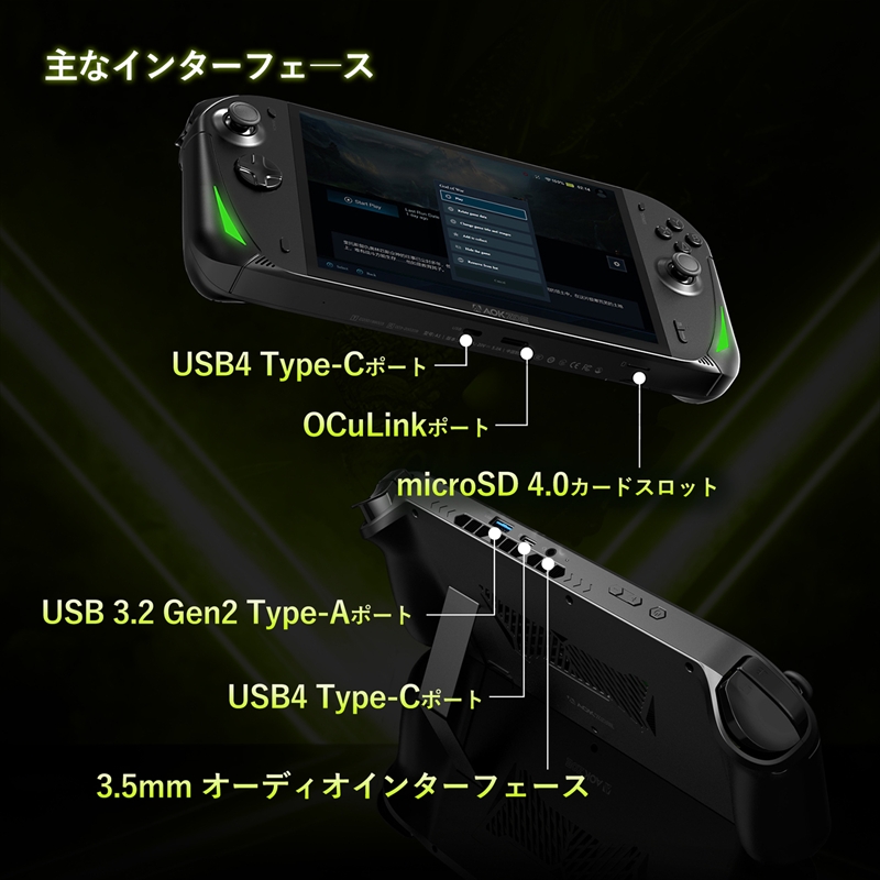 インターフェースは上部にUSB 3.2 Gen 2 Type-AとUSB 4、3.5mmイヤホンジャックを備え、下部にUSB 4とeGPUボックスなどを繋ぐOCuLink、microSDカードスロットを実装する。