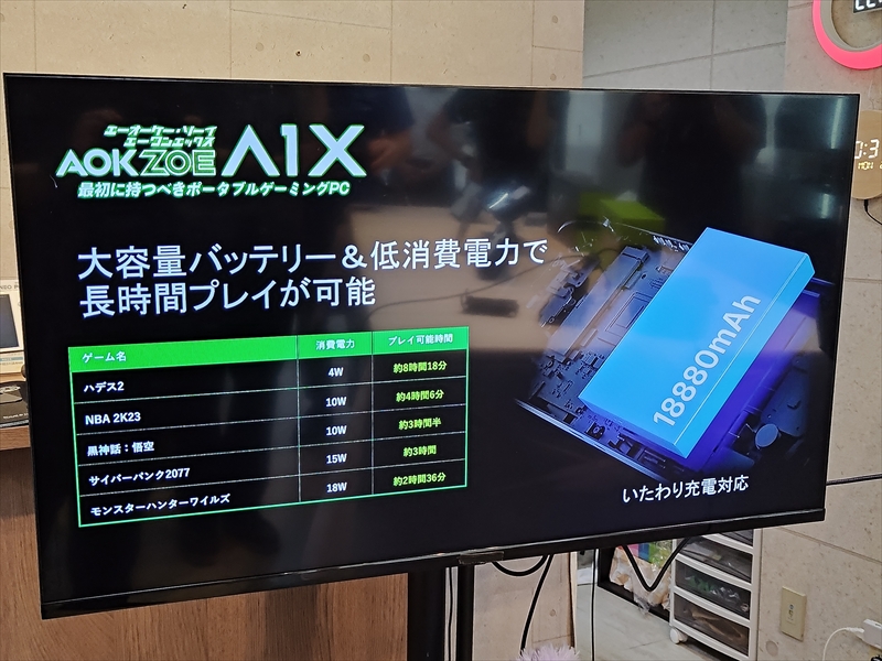 さらに、18880mAhの大容量バッテリーを搭載し、TDP 18Wほどで『モンスターハンターワイルズ』が2時間36分プレイでき、4Wと低消費電力なら軽いゲームが8時間以上プレイでき、10時間以上の動画視聴が行なえるとのこと。