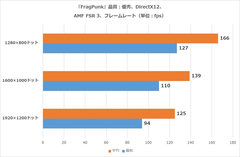 最後にいくつかの実ゲームの計測結果を見ていこう。まずは、軽めなFPSタイトルとして『FragPunk』のゲーム内ベンチマークでもチェックしてみた。ゲームバージョンは「376.0.15」、DirectX12で、品質は「優秀」にしてフレームレートを測定した。