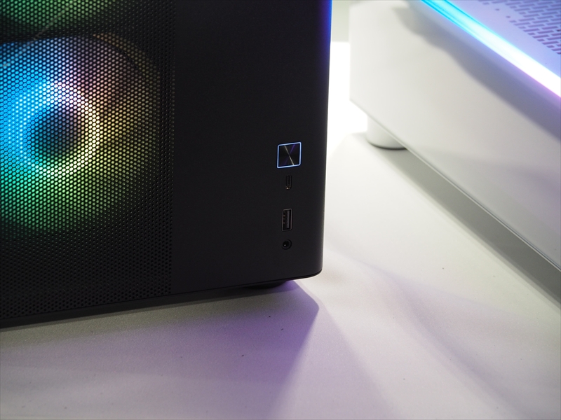 ミニタワーのXシリーズのフロントインターフェースは、フロントの右下にある。USB Type-CとUSB Type-Aが1ポートずつで、3.5mmジャックがあった