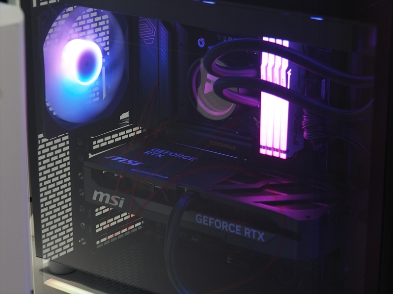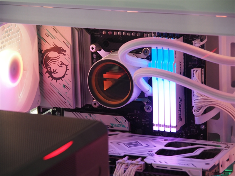 CPUクーラーのヘッドは、インフィニティ―ミラーになっていて、奥行きのあるライティングで映える形となっている。また、メモリーもLEDライティングで光る、ゲーミングPCらしい内装となっていた