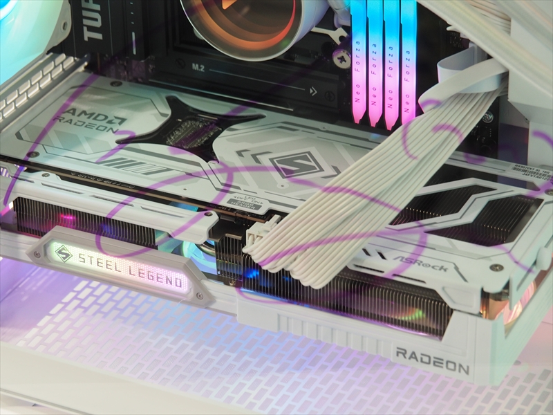ホワイトカラーのPCは、ASRockの白パーツの定番「Steel Legend」のRadeonが採用されていた