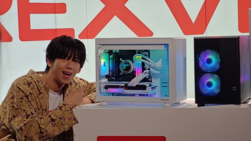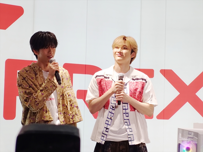 発表会では、ゲストとして9人組のメインダンサー&バックボーカルグループ「超特急」のリョウガさんと、ユーキさんが登壇。普段からゲーム配信もしているという2人は、新しい「FREX∀R」のPCを、ライティングで光りカッコイイ、未来感があると評した。