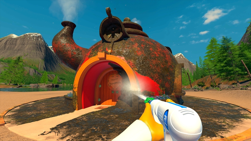 あらためて『PowerWash Simulator 』を説明すると、ウォッシャー(高圧洗浄機)を手にしたプレイヤーが主観視点で 水や洗剤を吹き出して、対象物の汚れを洗い落としていくゲーム。洗浄機から放たれる水がジリジリと汚れを落としていくのは不思議な快感がある。シンプルさゆえに半覚醒状態でもプレイできる(というかなってくる)ため、気づけば数時間が経過しているなんてこともザラだ。これ、実体験。