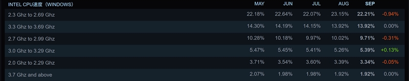 Intel CPUの動作クロックシェアは、1位が2.3~2.69GHzと低め。この辺りはモバイル向けCPUや、デスクトップ向けのエントリークラスCPUが該当するため、納得感がある。