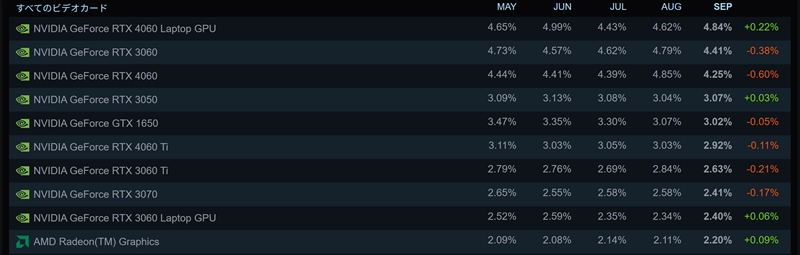 少し驚いたのは、1位にGeForce RTX 4060 Laptop、9位にGeForce RTX 3060 Laptopと、ノート向けのdGPUが入っていたこと。CPUの4コアが3位というのにも驚いたが、こうしてみると、ゲーミングノートPCでプレーしている人が結構な率でいるということがわかる。