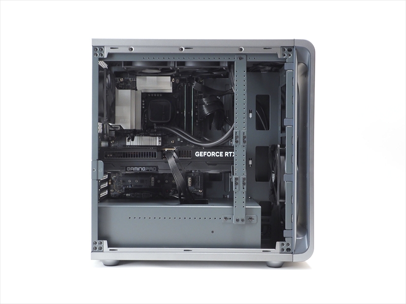 F Seriesは流行りのピラーレスデザイン筐体を採用したシリーズ。フロントおよびサイドの2面がガラス仕様なので、内部パーツを見て楽しめる。ARGB LEDイルミネーションも搭載。イルミネーション重視とあってCPUクーラーは240/360mm水冷クーラーの組み合わせだ。