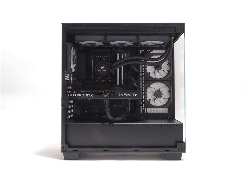 もう1台はF Series。こちらもミドルタワーで、ブラックのカラーリンクモデルになる。ブラック基板のマザーボード、ブラック外装のビデオカードで構成されており、ピラーレス筐体から覗く内部がかなり引き締まって見える。
