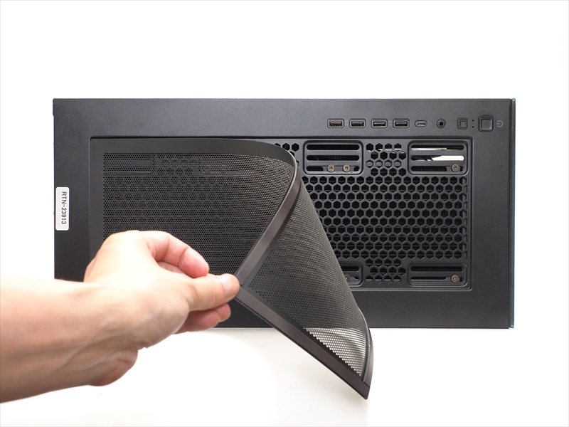 フィルターは底面部がスライド式着脱、トップパネル部がマグネット式着脱。メインの吸気にあたる右側面は細かなパンチング仕様となっているがフィルターはない。気になる方は市販のフィルターを用いるのがよいだろう。