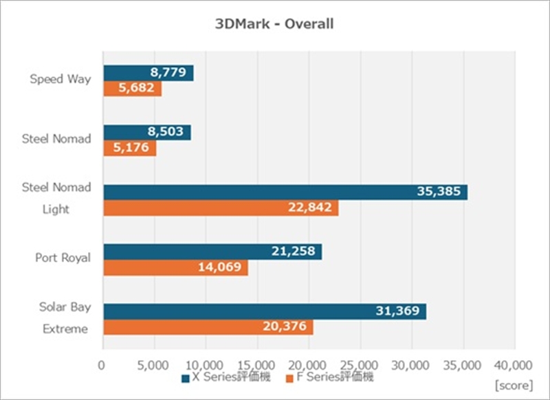 3DMarkはゲーミングPCの性能指標として多くのメーカーが採用している。この数値をほかの製品やお手持ちのPCの数値と比較できる。グラフにおいてSpeed Way、Steel Nomad……といった各テストは用いるグラフィックスAPIが異なる。