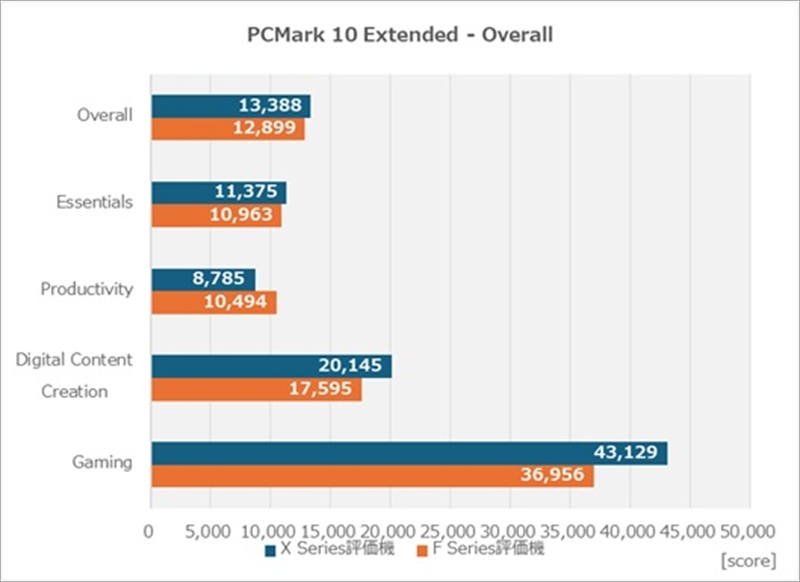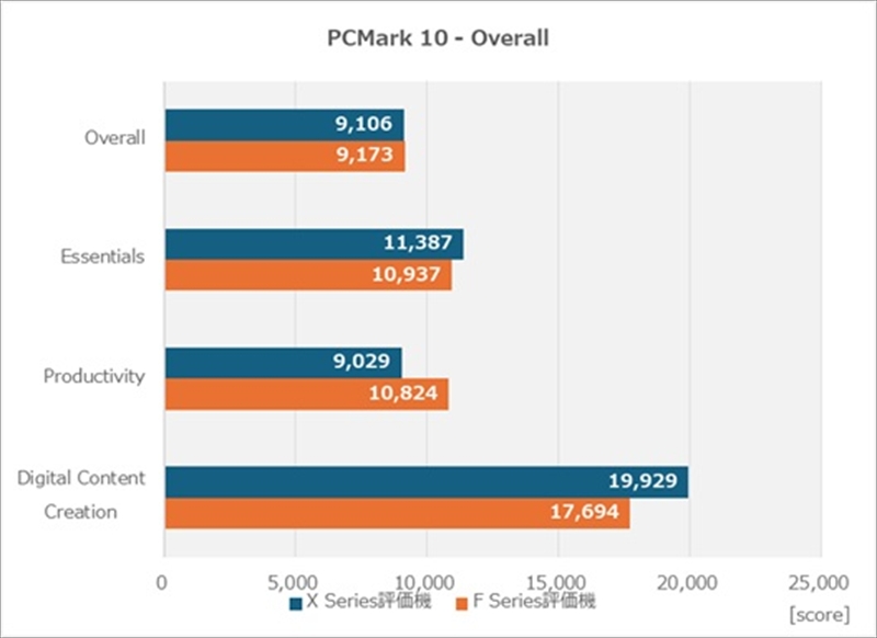 X SeriesとF Seriesで若干の差がついたが高スコアととらえてよい。PCMark 10では100ポイント単位で結果がバラつくのでその影響もある。3つ目のDigital Content Creationはクリエイティブ用途想定のシナリオだ。写真補正、映像編集などのテストが含まれる。