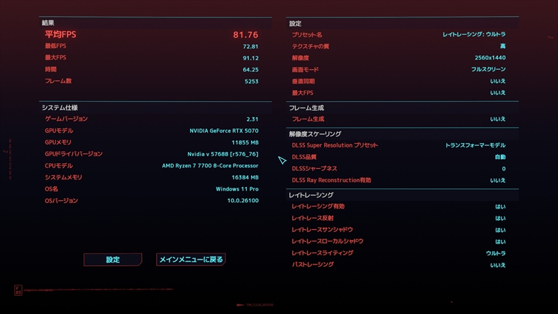 サイバーパンク2077のレイトレーシングはGPU負荷が高い。そのため、GeForce RTX 5070搭載モデルで4K、レイトレーシングを楽しもうとすると現実的なところで画質設定をレイトレーシング:低まで落とす必要があった。