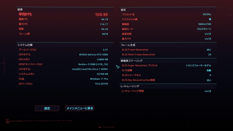 続いてサイバーパンク2077。解像度4K、画質設定レイトレーシング:オーバードライブ(もっとも高負荷)、フレーム生成ON(DLSS Frame Generation)といった設定で平均103.95fpsといった結果だった。フレーム生成ONを前提として、どちらのタイトルも4Kでもっとも画質のよい設定が楽しめる。