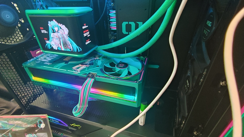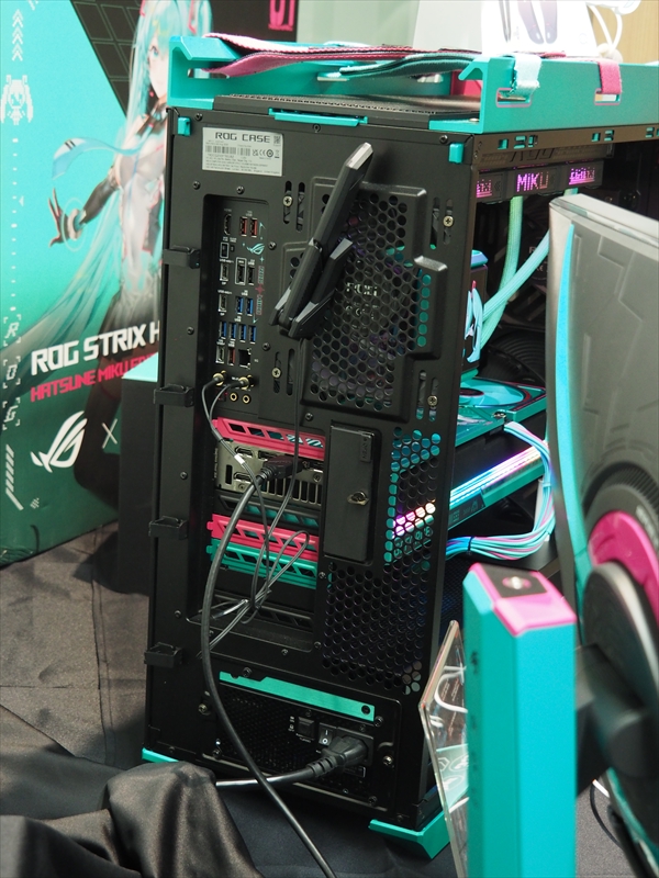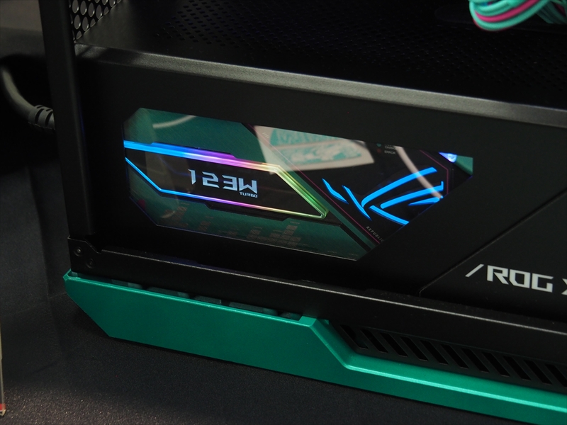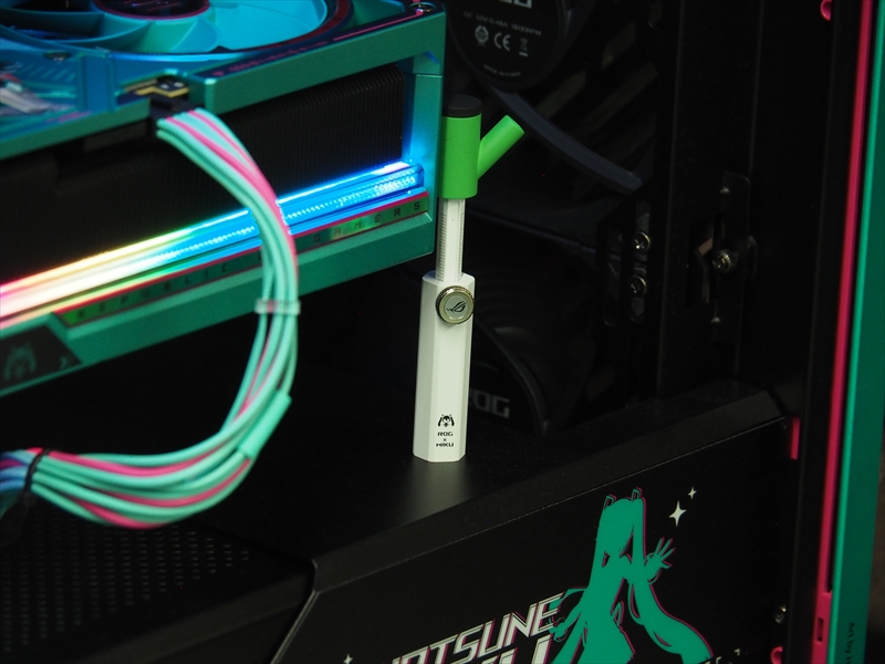 PCケースに付属するGPUステイは、ネギになっているコダワリよう。どうやら同社の本社の開発に初音ミクの大ファンがいて、ネギのデザインを採用したとのことだ。気になる人は、詳細が発表される10月17日の情報に期待しよう。