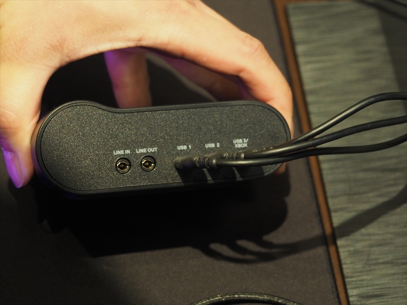 無線の送信機である付属の「GameHub」は、背面にUSB Type-Cが3ポートとLINE IN/OUTがあり、複数のデバイスを同時に接続できる。「OmniPlay」技術を搭載し、「GameHub」にPCやPlayStation、Nintendo Switch、Xboxといったゲーム機をUSB Type-C×3で、AUX×1を使い最大4つの入力からのオーディオをミックスできるとのこと。