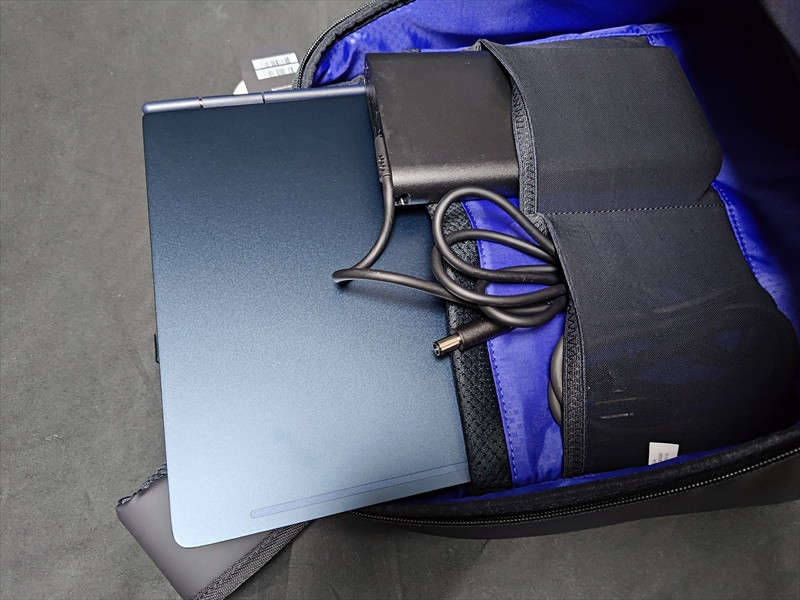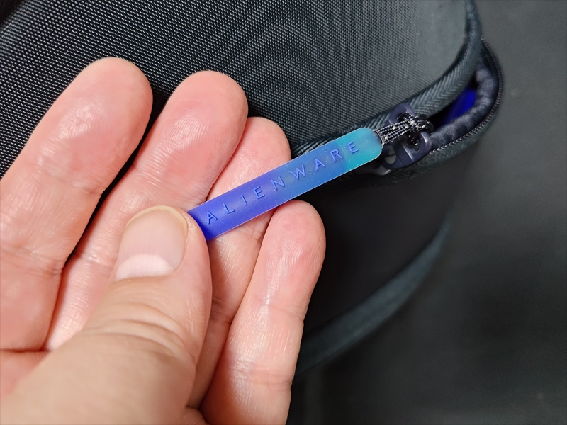 また、その大きなスリーブポケットの前面には、2つに分かれたメッシュのポケットもあり、カードケースなどの小物を入れて、分かり易く整理できるようになっている。試しに、「Alienware 16X Aurora」の大きめのACアダプターを入れてみたが、すっぽり入って収まった。