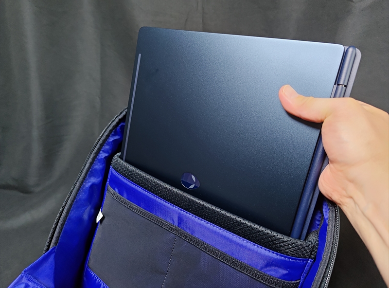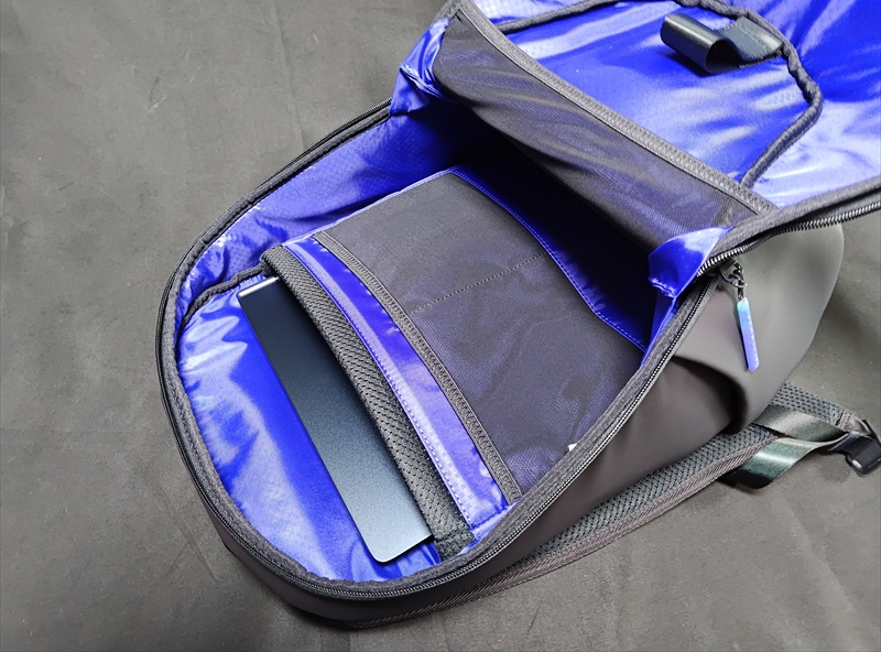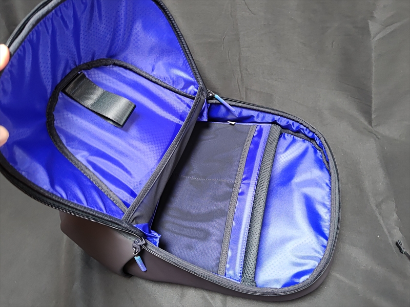 ボリューム容量は21Lと大きく、ノートPCだけでなく3~4日分の着替えを入れるなど、小旅行や数日間のビジネス用途にも使える大ボリュームだ。柔らかいポリエステル素材だけで作られたバックパックと異なり、荷物を入れていなくても膨らんだ形状を維持するボディー成型と、ある程度の強度がある上部バンパーにより、衝撃や落下から保護してくれるようになっている。