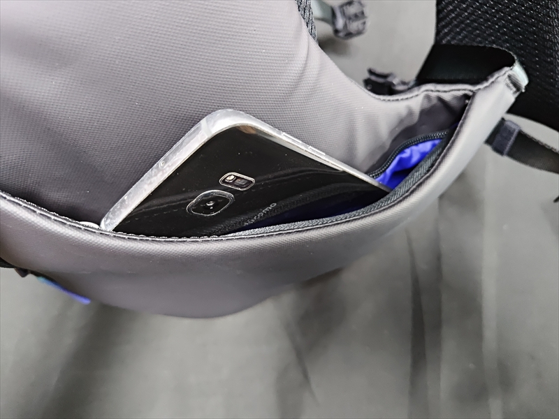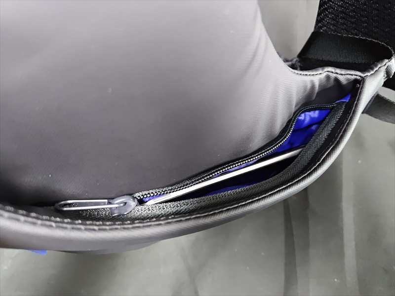 また、外側の側、背負った際の脇の下あたりにあたる、ショルダーストラップに繋がる部分にもポケットがある。小さいノートやスマートフォンくらいは収まる。手早く出したいキーケースや名刺入れなどを入れておくにも役立ちそうだ。