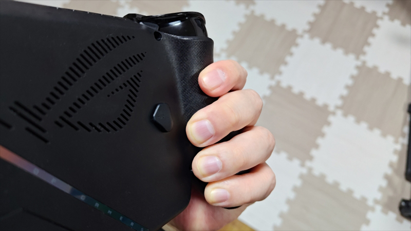 しかし、ROG Xbox Allyシリーズは、グリップ部分がXboxに付属するXboxワイヤレスコントローラ―のグリップ部分を、そのまま組み込んだようなデザインを採用。握った際に、小指と人差し指が、グリップの側面から内側にやや入り込むようにしっかりホールドできる。