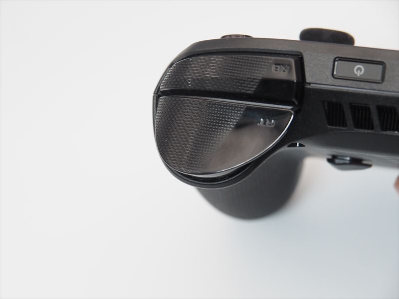 また、グリップとLRボタン、LRトリガーには滑り止めのシボ加工が施されている。LRボタンは中央に向かって盛り上がるデザインとなっていて、指を置いて探り易い。シボ加工は滑り止めになって、操作性は向上させてくれるが、手の皮脂が付着してしまうので、粘着クリーナーなどで掃除しないと、汚れが目立つようになりそうな点だけ、少し気になった。