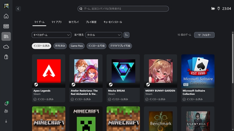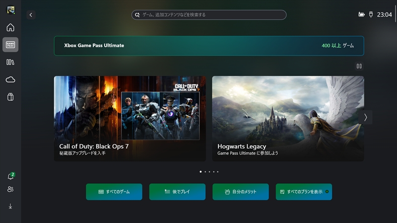 ROG Xbox Allyシリーズはそうした主要なプラットフォームに加え、Xbox Cloud Gaming、EA appも利用でき、そうしたプラットフォームのゲームが一元管理できる。左のタブでホーム画面から、Xbox Game Pass、マイライブラリなどに素早くアクセスが可能。