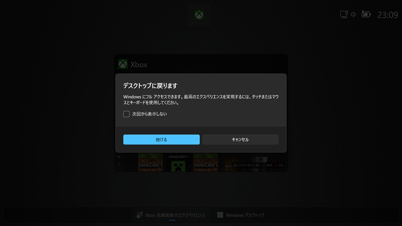 このままでは、通常のPCのように使えない。Xboxボタンを長押し(またはキーボードを接続して、Wiondwsボタンをクリック)すると、タスクの一覧が表示され、下部の「Windows デスクトップ」を選択することで、デスクトップが表示される。この際、たとえばスタートアップで有効にしていたアプリが同時に起動する。
