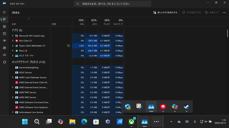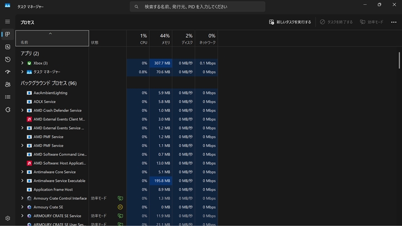 試しに、キーボードを接続してショートカットキーでタスクマネージャーを起動すると、立ち上げたタスクマネージャー以外には、Xboxアプリしか起動しておらず、ほかのバックグラウンドプロセスはメモリ上で待機しているだけの状態になっていた。