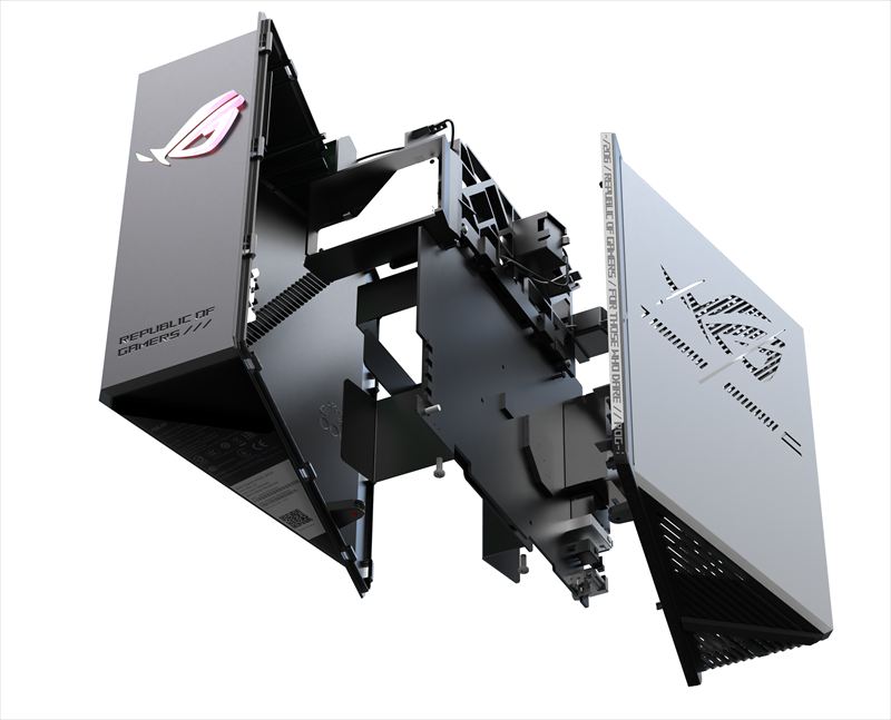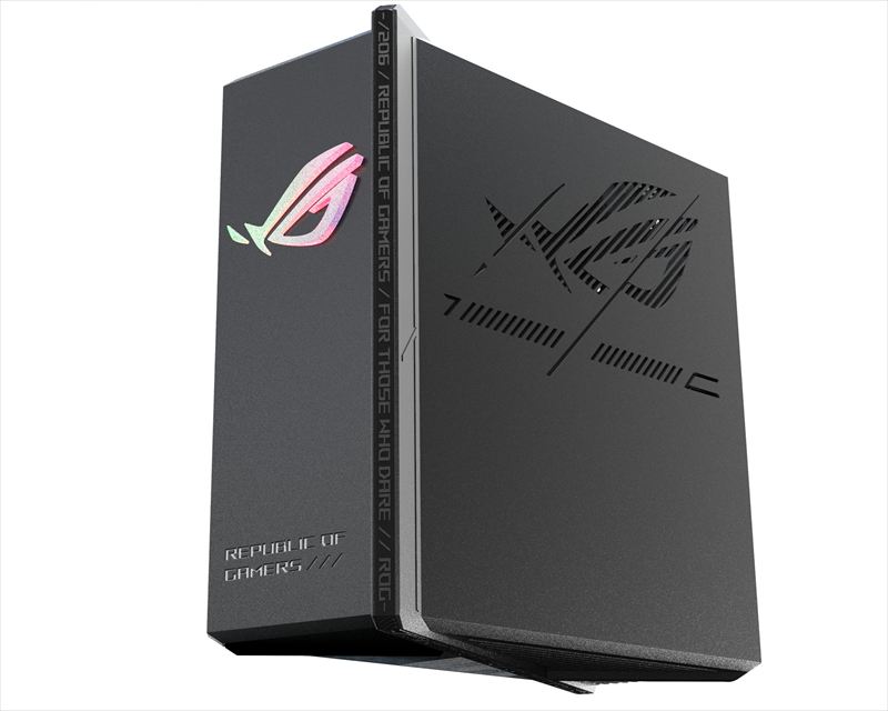 「Slash PCB」設計による放熱効率の高い筐体構造と、カーボンナノコーティングのアルミヒートシンクを採用。偏光仕上げのROGロゴとAURA RGBライティングが、ゲーミングルームを彩る。