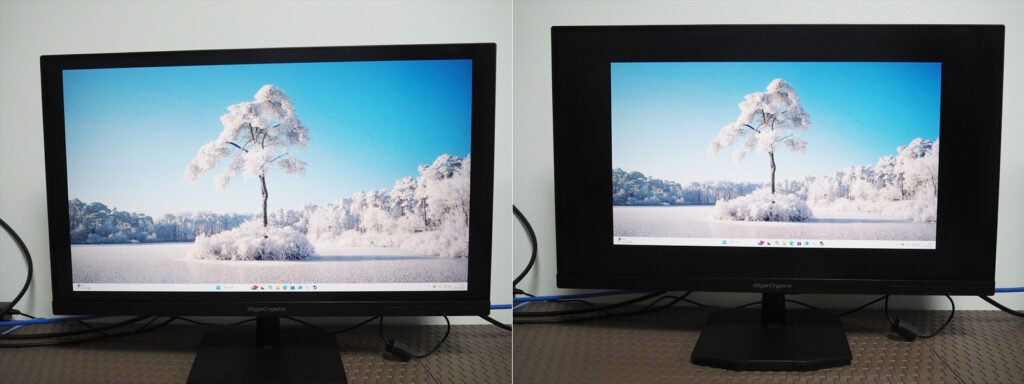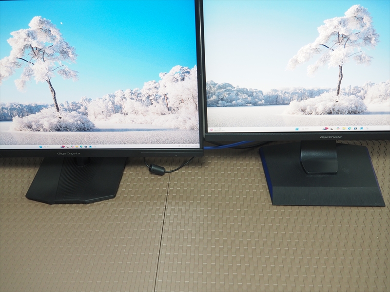 以下の画像は、左がレビュー対象のEX-GDQ271UA(27インチ・WQHD)で、右がEX-LDGC241UDB(23.8インチ・フルHD)となっている。両者を見比べれば、画面サイズの差が顕著であることがよくわかるはずだ。
