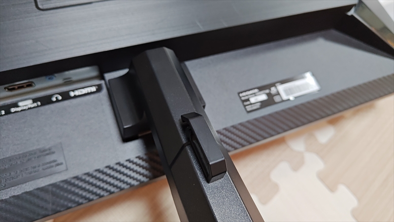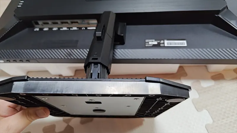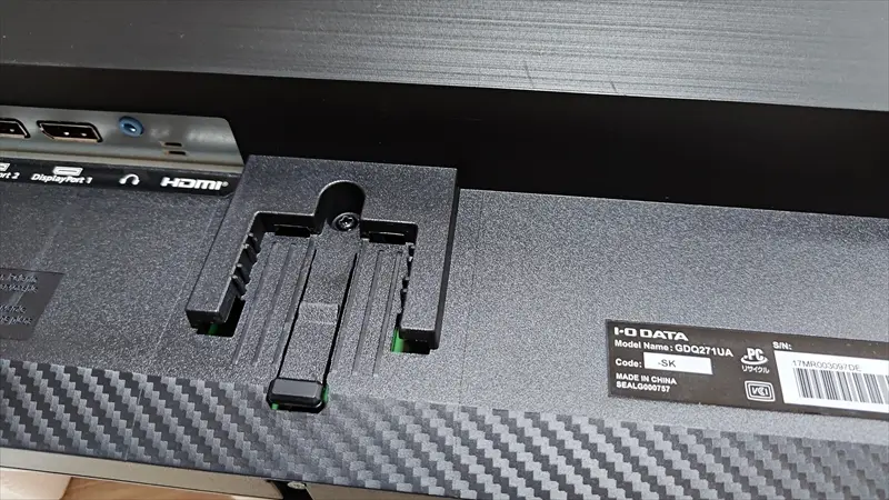 EX-GDQ271UAのスタンドは、背面下部の連結部で接続するシンプル構造でラクに装着できる。同社の多機能スタンドを搭載したモデルは、パネル背面のVESAマウントを搭載する部分にハメ込んでいた。高さ調整ができるなどのメリットがあったが、モニターアーム以外の小型PCを収めるVESAマウントホルダーなどは使用できなかった。