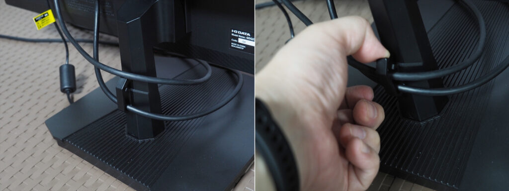 だが、スタンドの背面を見ると、コード掛け用のフック(ケーブルホールド)が付いているではないか。