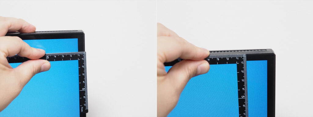 次に液晶パネルを囲む「ベゼル(枠)」の幅をチェックしてみると、横幅は約10mm、縦幅は0.7mmだった。一言で表すと、狭い。